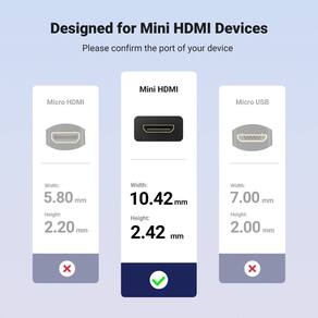 - Adaptador Mini HDMI para HDMI: NOTA: Certifique-se de que seu dispositivo tenha uma porta Mini HDMI. O conversor adaptador UGREEN HDMI para mini HDMI converte facilmente a porta mini HDMI 2.0 em seu laptop, filmadora, câmera ou até mesmo algum tablet em uma interface HDMI tipo A padrão na TV, monitor portátil ou projetor. Compacto e portátil