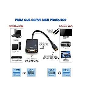 O Cabo Conversor Hdmi para Vga com Áudio, possibilita converter facilmente aparelhos com Saída hdmi (cabo HD de equipamentos mais recentes) para ligar em telas com Entrada vga (cabo clássico de monitores), além de poder passar áudio através da Saída de Áudio P2 (cabo de fone de ouvido) no conversor.Ele suporta resolução de até 1080P e é a solução para integrar aparelhos com saída digital hdmi como Notebooks, Computadores, Blu-ray, entre outros, a ambientes corporativos, salas de reunião, centros de treinamento ou locais que tenham apenas Monitores, TVs e Projetores com Entrada vga, então não troque todos os seus aparelhos devido à falta de conexão e nem prejudique sua apresentação devido à compatibilidade de equipamentos.Este Conversor Hdmi para Vga é compatível com diversos aparelhos, como Notebook, Computador, dvd, Blu-ray, vídeo games como Xbox 360 e PS3, entre outros aparelhos, exceto os modelos PS4 e PS5 que infelizmente não são compatíveis por conta da tecnologia hdcp dos aparelhos.Como funciona:Computador ou Notebook tem saída hdmi e o Monitor ou Projetor tem entrada Vga.Ligará a conexão hdmi do Conversor na saída do Notebook e ligará o Cabo Vga do Monitor na saída Vga do conversor, transmitindo assim o vídeo do notebook para o Monitor. Como a conexão Vga transmite apenas vídeo, o áudio pode ser transmitido para o monitor ligando o cabo P2 na saída do conversor e na entrada do monitor, caso este possua alto falante integrado ou ligando uma caixa de som diretamente na saída P2 do conversor.Exemplo, você pretende utilizar uma segunda tela em seu notebook, sendo que o notebook tem saída hdmi e o monitor tem entrada Vga (conexão Azul com 15 pinos). Basta conectar a ponta hdmi do conversor no notebook e o cabo vga do monitor na saída do conversor.Como não funciona:Computador ou Notebook tem saída vga e a TV ou Monitor tem entrada hdmi.O conversor não faz a conversão inversa, por isso é impossível ligar um computador ou outro aparelho com saída vga em uma TV ou Monitor com entrada hdmi.ESPECIFICAÇÃO: Converte saída Hdmi para Vga e Áudio P2; Condutor de alta qualidadeBanhados que evitam a perda do sinal; Plug & Play, instalação rápida e descomplicada sem necessidade de instalação de driver; Não precisa de alimentação externa de energia; Conexões: Hdmi Macho e vga Fêma; Suporta hdcp 1.0/1.1/1.2; Formatos hdmi 480i/576i/480p/576p/720p/1080i/1080p; Formatos vga 480i/576i/480p/576p/720p/1080i/1080p; Suporta resoluções: 800x600, 1024x768, 1280x720, 1280x1024, 1920x1080; Medidas:Cabo Conversor: aprox. 20 cm;Cabo P2 x P2 de áudio aprox. 50
