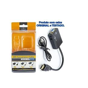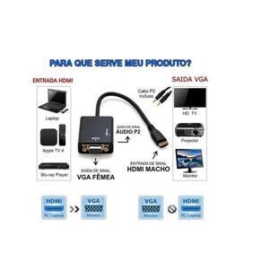O Cabo Conversor Hdmi para Vga com Áudio, possibilita converter facilmente aparelhos com Saída hdmi cabo HD de equipamentos mais recentes para ligar em telas com Entrada vga cabo clássico de monitores , além de poder passar áudio através da Saída de Áudio P2 cabo de fone de ouvido no conversor.Ele suporta resolução de até 1080P e é a solução para integrar aparelhos com saída digital hdmi como Notebooks, Computadores, Blu-ray, entre outros, a ambientes corporativos, salas de reunião, centros de treinamento ou locais que tenham apenas Monitores, TVs e Projetores com Entrada vga, então não troque todos os seus aparelhos devido à falta de conexão e nem prejudique sua apresentação devido à compatibilidade de equipamentos.Este Conversor Hdmi para Vga é compatível com diversos aparelhos, como Notebook, Computador, dvd, Blu-ray, vídeo games como Xbox 360 e PS3, entre outros aparelhos, exceto os modelos PS4 e PS5 que infelizmente não são compatíveis por conta da tecnologia hdcp dos aparelhos.Como funciona:Computador ou Notebook tem saída hdmi e o Monitor ou Projetor tem entrada Vga.Ligará a conexão hdmi do Conversor na saída do Notebook e ligará o Cabo Vga do Monitor na saída Vga do conversor, transmitindo assim o vídeo do notebook para o Monitor. Como a conexão Vga transmite apenas vídeo, o áudio pode ser transmitido para o monitor ligando o cabo P2 na saída do conversor e na entrada do monitor, caso este possua alto falante integrado ou ligando uma caixa de som diretamente na saída P2 do conversor.Exemplo, você pretende utilizar uma segunda tela em seu notebook, sendo que o notebook tem saída hdmi e o monitor tem entrada Vga conexão Azul com 15 pinos . Basta conectar a ponta hdmi do conversor no notebook e o cabo vga do monitor na saída do conversor.Como não funciona:Computador ou Notebook tem saída vga e a TV ou Monitor tem entrada hdmi.O conversor não faz a conversão inversa, por isso é impossível ligar um computador ou outro aparelho com saída vga em uma TV ou Monitor com entrada hdmi.ESPECIFICAÇÃO: Converte saída Hdmi para Vga e Áudio P2; Condutor de alta qualidadeBanhados que evitam a perda do sinal; Plug & Play, instalação rápida e descomplicada sem necessidade de instalação de driver; Não precisa de alimentação externa de energia; Conexões: Hdmi Macho e vga Fêma; Suporta hdcp 1.0/1.1/1.2; Formatos hdmi 480i/576i/480p/576p/720p/1080i/1080p; Formatos vga 480i/576i/480p/576p/720p/1080i/1080p; Suporta resoluções: 800x600, 1024x768, 1280x720, 1280x1024, 1920x1080; Medidas:Cabo Conversor: aprox. 20 cm;Cabo P2 x P2 de áudio aprox. 50