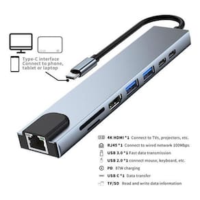 Especificações: - tipo de interface: usb tipo c - número de portas: 8 - acabamento: alumínio - comprimento do cabo: 12,5cm - função: hdtv, leitor de cartão, rj45 ethernet - padrão: usb 3.0 - tipo: 8 em 1 - material: alumínio - porta 1: rj45 - porta 2: tf/sd card - porta 3: hdtv port - porta 4: pd change - porta 5: usb 3.0 - compátível 1: macbook pro air - compátível 2: type-c port laptop - compátível 3: lenovo, dell, asus. - compátível 4: nintendo switch