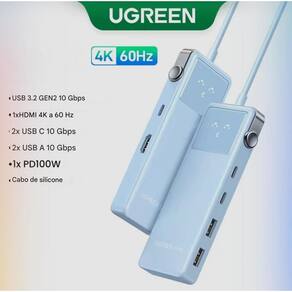 Hub usb c ugreen uno 10gbps hdmi 4k 60hz pd 100w carregamento 4 portas de dados 2a2c estação de acoplamento 6 em 1 compatível com macbook//pro/air//mini/m4//17/pro/max/16/15/galaxy s25 ultra series. Hub 6 em 1: hub ugreen usb c equipado com uma porta hdmi 4k de 60 hz, uma porta usb-c pd de 100w, duas portas de dados usb-c de 10 gbps e duas portas de dados usb a de 10 gbps. Transfira arquivos em segundos: a combinação de portas usb-a 3.2 e usb-c 3.2 de 10 gbps transfere arquivos grandes rapidamente e melhora a eficiência do trabalho. Carregamento usb-c de 100w: equipado com uma porta usb-c pd de 100w, o hub usb c oferece carregamento rápido e eficiente para seu laptop em casa, no escritório ou em trânsito. Display led e cabo trançado durável: expressões engraçadas de robôs da série ugreen uno, cabo trançado dobrado mais de 20.000 vezes em testes de laboratório é mais durável Carregamento rápido pd 100w este dock usb c fornece até 85w de potência de carregamento se você conectar um carregador de 100w, o hub consome 15w através da porta de carregamento pd, que carrega seu dispositivo host laptop/tablet/celular em alta velocidade. Dica: 1. Não conecte periféricos como disco rígido ou monitor através desta porta pd, pois ela não suporta transferência de dados e vídeo. 2. O carregador de 100w não está incluído. Ampla compatibilidade o adaptador usb c multiporta é compatível com macbook/pro/ m4/m3/m2/m1,/2024 - 2019 ,/macbook/air/ m4/m3/m2/m1,/2025 - 2020 ,/,/mini,/m4/imac,/xps/17/15/13,/magicbook/16/pro,/thinkbook/14,/asus,/zenbook,/matebook,/pro/14/13,/surface/pro/10/9/8,//pro/2024 - 2018,//air/2025 - 2020,/galaxy tab s11/s10/s11,/,/17//17/pro//17/pro/max//16/15/series,/galaxy s25/s25+/s25 ultra/s24, steam,/deck, ally/rog, etc. Observação: plug and play nos sistemas windows,/11/10/8.1/8,/macos/e/ipados. Ao usar a porta ethernet, é necessário instalar o driver no windows 7/xp/vista/e/linux. -marca ugreen -cor blue / azul 5,03 x 1,99 x 0,62 cm; 100g Homologação Anatel: 074531900160