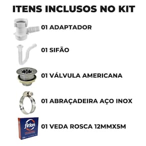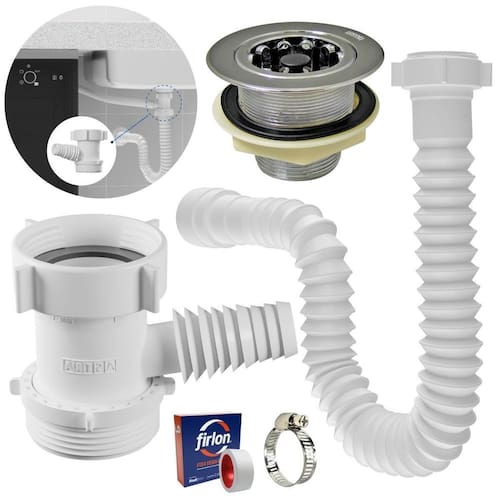 Adaptador para máquina de lavar louça + válvula americana + sifão sanfonado universal + abraçadeira 1 + fita veda rosca Adaptador para máquina de lavar louça astra O adaptador de saída de água da marca astra é um dispositivo especialmente projetado para facilitar a conexão da sua máquina de lavar louça ao sistema de encanamento existente. Com suas múltiplas opções de entrada e saída, este adaptador é compatível com tubulações de 1.1/4'' e 1.1/2'', garantindo uma instalação conveniente e segura. Possui uma variedade de espigões disponíveis, incluindo tamanhos de 3/4'', 7/8'' e 1''. Essa diversidade de espigões permite que você escolha o tamanho mais adequado para o seu sistema de encanamento, assegurando uma conexão firme e eficiente. Além de sua funcionalidade prática, o adaptador apresenta um acabamento branco, proporcionando um visual limpo e elegante ao conjunto. Especificações tecnicas Material: polipropileno Entrada: 1.1/2 Saída para sifões: 1.1/4 ou 1.1/2 Espigões para mangueiras: 3/4; 7/8 e 1 do fabricante: 90 dias Válvula americana de 3.1/2 cromada astra A válvula americana sem adaptador cromada da astra é uma excelente escolha para quem busca combinar elegância e praticidade. Com um acabamento cromado, essa peça possui um design moderno e sofisticado que valoriza qualquer ambiente. Além disso, ela é compatível com sifões articulados, rígidos e sanfonados, o que permite sua utilização em diferentes tipos de pias e lavatórios. Outra vantagem da válvula americana é o seu cesto removível, que facilita a limpeza e evita o acúmulo de resíduos. Essa característica também contribui para a durabilidade da peça, já que impede o entupimento e a corrosão. Com um ótimo custo-benefício, essa válvula americana é uma solução interessante para quem busca qualidade e praticidade sem abrir mão da estética. Seu acabamento cromado confere um aspecto sofisticado e elegante, enquanto sua compatibilidade com diferentes tipos de sifões e o cesto removível agregam praticidade e durabilidade. Especificações técnicas Material: abs cromado Possui ladrão: não Possui unho: não Possui adaptador: não Entrada para sifão: 1.1/2 Utilização: pia do fabricante: 90 dias Sifão sanfonado universal 61cm branco astra O sifão sanfonado universal astra é um acessório essencial de encanamento, projetado para se adaptar a qualquer saída de válvula de pia e a qualquer tubulação de esgoto, independentemente de seu tamanho ou tipo. Além disso, o sifão sanfonado universal astra corrige possíveis desalinhamentos entre a cuba e a tubulação de despejo, evitando assim a formação de bloqueios e obstruções que possam causar vazamentos ou refluxo de água suja. Esse acessório é ideal para tanques, pias e cubas em banheiros, cozinhas e lavanderias. Especificações técnicas Material: polipropileno Entrada para válvula polegada : 7/8 Saída para tubos e conexões: 38, 40, 48 e 50mm Modelo: para pias, cubas, tanques, lavatórios e válvula americana Suporta temperatura até: 90 graus Cor: branco Acabamento: brilhante do fabricante: 90 dias Manual de instalação: sim O kit segue com todos os itens para montagem e pronto para uso após a instalação - 90 dias para o adaptador de máquina de lavar louça - 90 dias para o sifão - 90 dias para a abraçadeira Itens inclusos 01 adaptador para máquinas de lavar louça 01 sifão 01 válvula americana 01 rolo de fita veda rosca 12mm x 5m 01 abraçadeira de inox 1