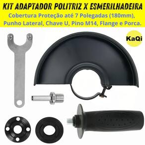 Adaptador Politriz Lixadeira Esmerilhadeira Kit Protetor Disco Chave Punho Auxiliar M14 Corte KaQi Kit Adaptador Politriz x Lixadeira Esmerilhadeira KaQi ADAP-POL-ESM. Para acessórios até 7 polegadas ou 180mm. O kit adaptador politriz KaQi chegou para transformar sua politriz em uma ferramenta versátil. Permite ampliar as possibilidades da sua ferramenta sem precisar comprar uma nova lixadeira ou esmerilhadeira. É um conjunto completo com cobertura protetora para acessórios de até 7 Polegadas ou 180mm, punho lateral angular, chave de aperto U, pino M14, flange e porca. Basta realizar o encaixe e aperto no eixo M14 da politriz, e já será possível utilizar inúmeros acessórios para uma infinidade de serviços, e, assim, resolver problemas de incompatibilidade da politriz com diversos acessórios essenciais para lixar, cortar e desbastar. Ao transformar sua politriz em uma ferramenta multifuncional, é possível economizar dinheiro, já que não precisará investir em múltiplas ferramentas. Ganha-se também, em versatilidade, pois irá realizar uma variedade de trabalhos, desde polimento fino até lixamento de superfícies, desbaste de materiais, cortes precisos utilizando o disco apropriado para cada função e material . Ainda, aumentar a produtividade, tendo sempre à mão, a ferramenta certa para cada etapa do projeto, otimizando tempo e esforço. Componentes do kit: 1 Cobertura Proteção até 7 Polegadas 180mm ; 1 Punho Lateral; 1 Chave U; 1 Pino M14; 1 Flange; 1 Porca. Medidas da caixa: 19 x 19 x 10cm. Peso total: 0,6kg. Modelo: ADAP-POL-ESM. EAN: 7908840106605. : 3 Meses. Marca KaQi. Não fazemos alterações posteriores em pedidos. Imagens do anúncio são ilustrativas. Marca: Magazine Girassol