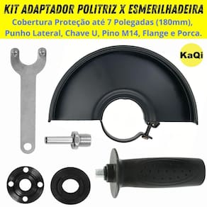 Adaptador Politriz Lixadeira Esmerilhadeira Kit Protetor Disco Chave Punho Auxiliar M14 Corte KaQi Kit Adaptador Politriz x Lixadeira Esmerilhadeira KaQi ADAP-POL-ESM. Para acessórios até 7 polegadas ou 180mm. O kit adaptador politriz KaQi chegou para transformar sua politriz em uma ferramenta versátil. Permite ampliar as possibilidades da sua ferramenta sem precisar comprar uma nova lixadeira ou esmerilhadeira. É um conjunto completo com cobertura protetora para acessórios de até 7 Polegadas ou 180mm, punho lateral angular, chave de aperto U, pino M14, flange e porca. Basta realizar o encaixe e aperto no eixo M14 da politriz, e já será possível utilizar inúmeros acessórios para uma infinidade de serviços, e, assim, resolver problemas de incompatibilidade da politriz com diversos acessórios essenciais para lixar, cortar e desbastar. Ao transformar sua politriz em uma ferramenta multifuncional, é possível economizar dinheiro, já que não precisará investir em múltiplas ferramentas. Ganha-se também, em versatilidade, pois irá realizar uma variedade de trabalhos, desde polimento fino até lixamento de superfícies, desbaste de materiais, cortes precisos utilizando o disco apropriado para cada função e material . Ainda, aumentar a produtividade, tendo sempre à mão, a ferramenta certa para cada etapa do projeto, otimizando tempo e esforço. Componentes do kit: 1 Cobertura Proteção até 7 Polegadas 180mm ; 1 Punho Lateral; 1 Chave U; 1 Pino M14; 1 Flange; 1 Porca. Medidas da caixa: 19 x 19 x 10cm. Peso total: 0,6kg. Modelo: ADAP-POL-ESM. EAN: 7908840106605. : 3 Meses. Marca KaQi. Não fazemos alterações posteriores em pedidos. Imagens do anúncio são ilustrativas. Marca: Não Informado