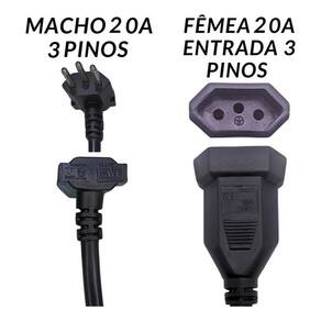 Especificações técnicas: Corrente nominal: 20 amperes macho e fêmea Voltagem: 127v / 220v Conexão: 3 pinos fase, neutro e terra Ângulo: 90 graus Comprimento: 18 cm Certificado inmetro