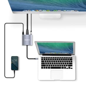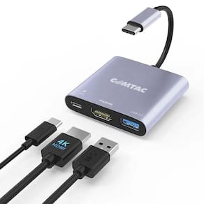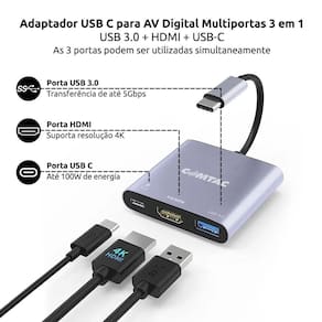 Com o adaptador de USB C para AV digital multiportas Comtac, você pode conectar seu Mac ou iPad com porta USB C a um monitor HDMI, um dispositivo com conector USB 3.0 padrão e um cabo carregador USB C simultaneamente. A porta USB 3.0 permite que você se conecte a outros periféricos compatíveis e desfrute de transferência de até 5 Gbps para fazer backup de arquivos ou transferir dados rapidamente. Com este adaptador, você pode espelhar a tela do seu Mac ou iPad numa TV, monitor ou projetor com conexão HDMI usando um cabo HDMI (vendido separadamente). Resolução 4K para fornecer vídeos nítidos e de alto nível. Você também pode conectar um cabo carregador à porta USB C para recarregar seu Mac ou iPad. A tecnologia Power Delivery Charging (PD) fornece passagem de energia de 100W Design compacto. Material alumínio para melhor dissipação do calor. Interface de entrada: USB C Interface de saída: USB 3.0 SuperSpeed, HDMI 1.4, USB C 100W PD Chipset: CS526 USB 3.0: transferência de dados de até 5 Gbps HDMI 1.4: resolução máxima de 3840 X 2160 - 4K@30Hz / 2K@60Hz USB C: passagem de energia de 100W para recarregar seu Mac ou iPad Sistemas operacionais compatíveis: macOS Mojave 10.14.6 ou superior e iOS 12.4 ou superior Compatível: Mac e iPad Plug & Play Ean: 7898562694330