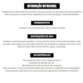 Kit Formado por: 12un - Creatina 300g DESCRIÇÃO CREATINA 300G A Creatina é um dos suplementos alimentares com mais estudos comprovando sua eficácia. Ela é um aminoácido de origem animal, mas que também é produzida pelo nosso próprio corpo. A função da Creatina é regenerar o ATP, que é a principal fonte de energia do nosso corpo. Portanto, quando há o estoque de Creatina em nosso organismo, conseguimos manter o exercício por mais tempo. Além disso, ela é usada para prevenir doenças como o Alzeheimer e o Parkinson. Como tomar Creatina? Sempre recomendamos a consulta a profissional de nutrição. Porém, de acordo com a ANVISA, o recomendável é a ingestão diária de 3g, visto que nosso corpo já produz 2g.