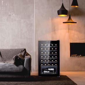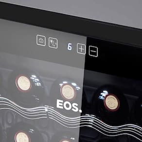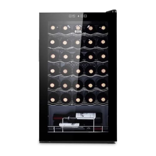 Adega climatizada EOS para 34 garrafas com refrigeração por compressor, gás ecológico, painel touch screen, controle de temperatura entre 6°C e 18°C, iluminação interna em LED, baixo nível de ruído e sistema anti vibração.Capacidade total de garrafas