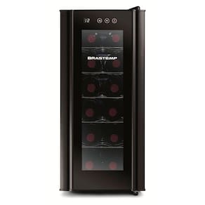 Adega climatizada Brastemp com capacidade para 12 garrafas, controle eletrônico Touch Sensor, display de temperatura na porta, iluminação LED, porta de vidro e prateleiras.Capacidade total de garrafas