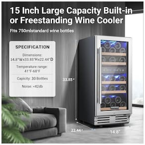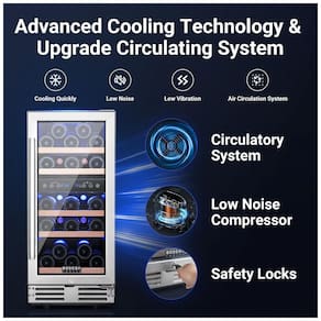 Adega climatizada com controle digital de temperatura, zona dupla, capacidade para 28 garrafas, compressor avançado, sistema de absorção de vibração, baixo ruído (<42 dB), painel de controle digital com display LCD e luz LED azul, instalação versátil (sob balcão ou independente).Capacidade total de garrafas