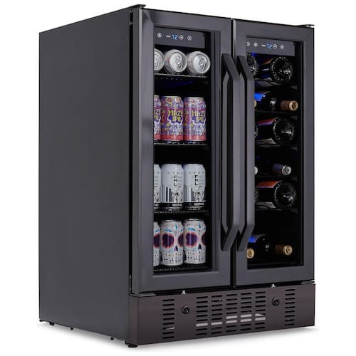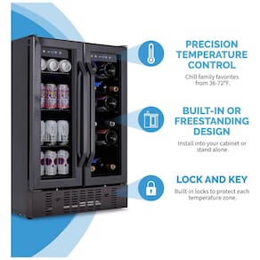TODAS AS SUAS BEBIDAS FAVORITAS EM UM LUGAR Esta geladeira de bebidas de zona dupla possui duas áreas de zenamento lado a lado, permitindo que você mantenha vinho tinto quente e bebidas gaseificadas geladas. As portas de vidro com painéis duplos oferecem excelente isolamento e podem ser trancadas para maior segurança. Os LEDs azuis iluminam o interior para um visual moderno.