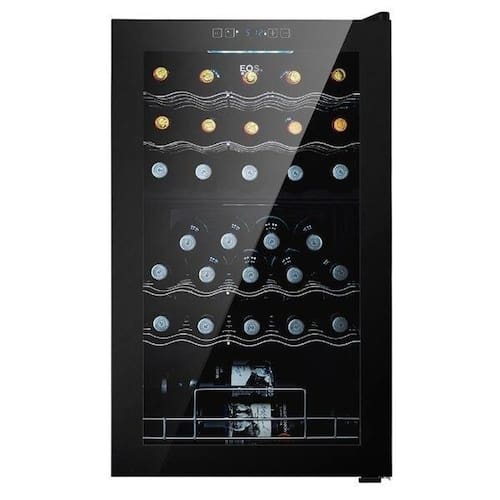 Adega climatizada dual zone EOS para 33 garrafas, com controle digital touch, iluminação LED, porta com vidro duplo, prateleiras em inox e refrigeração por compressor com gás ecológico.Capacidade total de garrafas