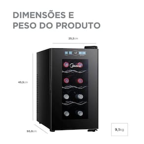 Adega climatizada Midea para 8 garrafas, com porta de vidro duplo Low-E, painel touch, temperatura ajustável de 12°C a 18°C, sistema de refrigeração termoelétrico.Capacidade total de garrafas