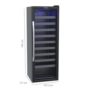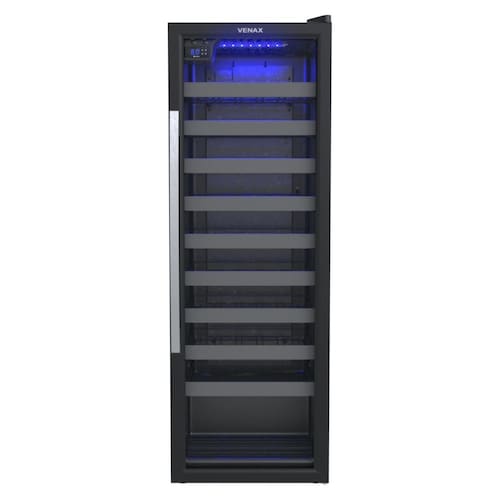 Adega climatizada Venax Piubella 200 preta, com capacidade para 50 garrafas, controle digital de temperatura (6°C a 20°C), iluminação interna LED azul e sistema de refrigeração por compressor.Capacidade total de garrafas