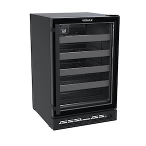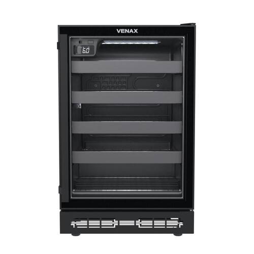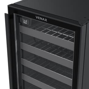 Adega de embutir Venax Cave IN 100, capacidade para 24 garrafas, controlador digital de temperatura (6°C a 20°C), iluminação interna LED, porta de vidro duplo LOW-E, sistema de refrigeração por compressor, gás refrigerante R134a.Capacidade total de garrafas