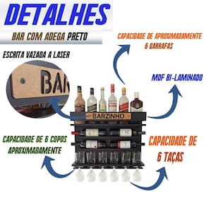 Marca: co2beer Modelo: bar wine Material: mdf bilaminado de 15mm. Dimensões: 60cm de largura x 51cm de altura x 13cm de profundidade Capacidade: aproximadamente 6 garrafas + 6 copos wisky + 6 taças de vinho/espumante.