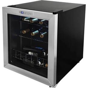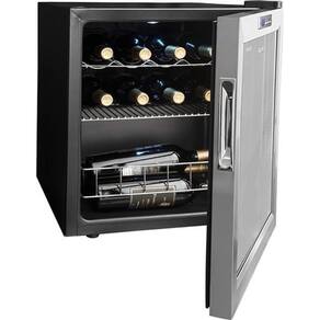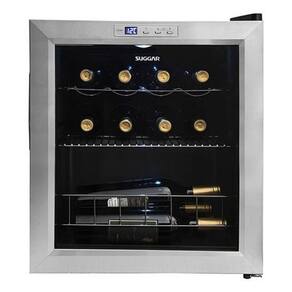 Adega climatizada Suggar Cannes com capacidade para 13 garrafas, refrigeração por compressor, iluminação interna em LED, prateleiras cromadas removíveis, porta em aço inox com vidro integrado, display digital para controle de temperatura e baixo consumo de energia.Capacidade total de garrafas