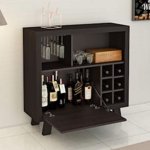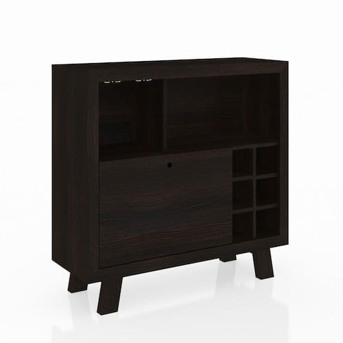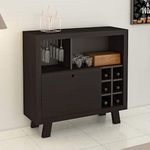Todo amante de vinho sabe o quanto é importante ter uma adega para garantir a qualidade da bebida e armazenar adequadamente, também contribui para dar um estilo diferenciado ao ambiente e ajudando com a decoração. Sua estrutura é em MDP 15mm e seu acabamento em BP, os pés em MDP tamburato, conta com suporte metálico para 6 taças, colmeia para 6 garrafas e uma porta basculante.