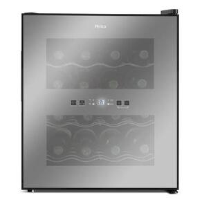 Adega Philco PAD16E com capacidade para 16 garrafas, controle digital de temperatura (10°C a 18°C), prateleiras cromadas deslizantes, porta com vidro duplo, iluminação LED, baixo nível de ruído e sistema eletrônico de refrigeração.Capacidade total de garrafas
