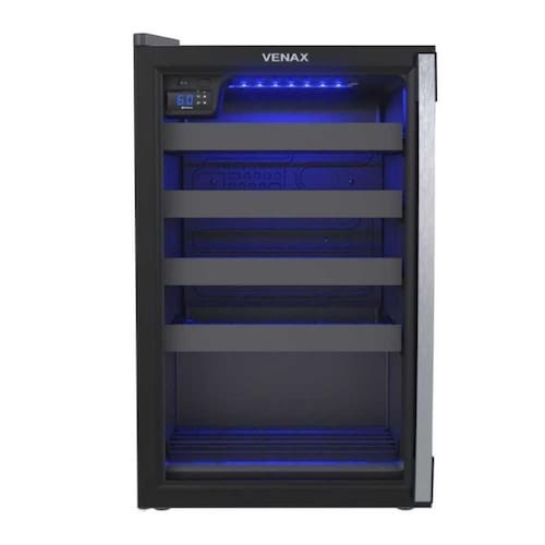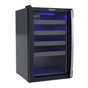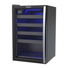 Adega com controle digital de temperatura, iluminação LED azul, porta de vidro duplo (LOW-E), puxador de alumínio, degelo natural, 4 prateleiras deslizantes e 1 fixa, sistema de refrigeração por compressor, pés frontais reguláveis e traseiros com rolete.Capacidade total de garrafas