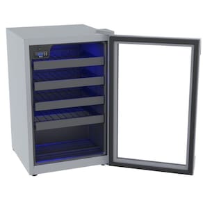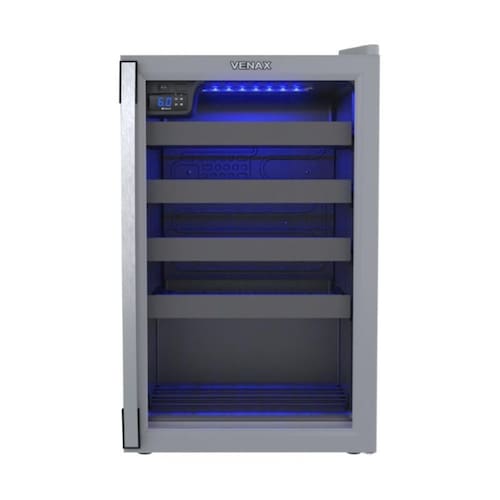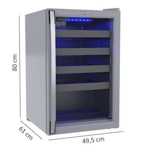 Adega Piubella 100 para 24 garrafas com controlador digital de temperatura (6°C a 20°C), iluminação interna LED azul, porta de vidro duplo (LOW-E), prateleiras deslizantes e fixa, sistema de refrigeração com compressor e gás refrigerante R134a.Capacidade total de garrafas