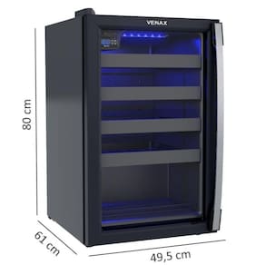 Adega Venax PiuBella Cave 100 para 24 garrafas, com controlador digital de temperatura (6°C a 20°C), iluminação interna LED azul, porta de vidro duplo LOW-E, prateleiras deslizantes, sistema de refrigeração por compressor e gás refrigerante R134a.Capacidade total de garrafas