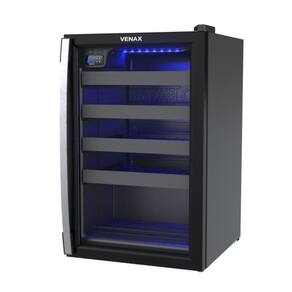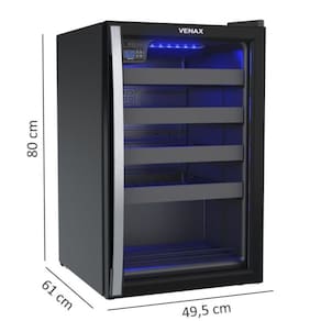 Adega para 24 garrafas com controlador digital de temperatura (6°C a 20°C), iluminação interna LED azul, porta de vidro duplo (LOW-E), 4 prateleiras deslizantes e 1 fixa, sistema de refrigeração por compressor e gás refrigerante R134a.Capacidade total de garrafas