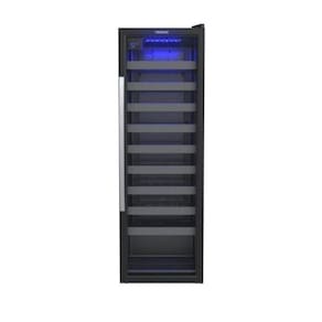 Adega Venax Piubella 200 para 50 garrafas, controlador digital de temperatura (6°C a 20°C), iluminação interna LED azul, porta de vidro duplo, prateleiras deslizantes, sistema de refrigeração com compressor.Capacidade total de garrafas