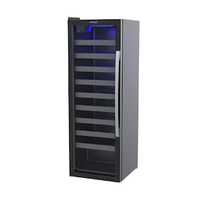 Adega de vinho com porta invertida, capacidade para 50 garrafas, temperatura ajustável entre 6°C e 20°C, iluminação interna em LED azul, sistema de refrigeração por compressor, degelo natural com dreno traseiro, prateleiras deslizantes, pés frontais reguláveis e traseiros com rolete.Capacidade total de garrafas