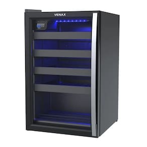 Adega Venax Piubella para 24 garrafas com controlador digital de temperatura (6°C a 20°C), iluminação interna LED azul, porta de vidro duplo, 4 prateleiras deslizantes e 1 fixa, sistema de refrigeração por compressor e gás refrigerante R134a.Capacidade total de garrafas
