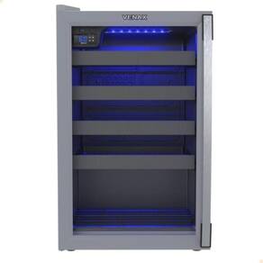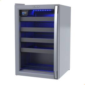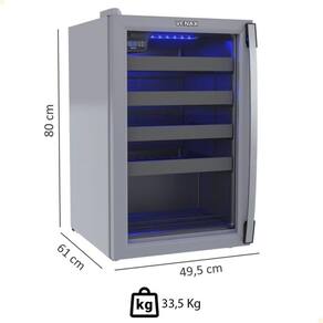 Adega com porta invertida, iluminação LED azul, puxador de alumínio, degelo natural, dreno traseiro, 4 prateleiras deslizantes e 1 fixa, sem ar forçado, sistema de refrigeração por compressor, pés frontais reguláveis e traseiros com rolete.Capacidade total de garrafas