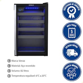 A adega mede 61 x 49,5 x 79 cm, pesa 33,5 kg e possui 1 ano de garantia, assegurando qualidade e confiabilidade da marca Venax. Tipo de alimentação: Elétrica | Capacidade de armazenamento: 24 garrafas | ProdutoAltura-cm: 79 | ProdutoLargura-cm: 50 | Modelo: Não Informado | Marca: Venax | EmbalagemComprimento-cm: 61 | Cubagem: 0.269620 | Peso Líquido: 35.0000 | EmbalagemLargura-cm: 52 | EmbalagemAltura-cm: 85 | Altura Produto: 79 | Largura Produto: 50 | Dias Entrega Fornecedor: 1
