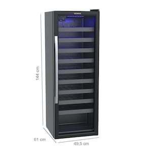 Adega com controle digital de temperatura, iluminação interna em LED azul, porta de vidro duplo (LOW-E), puxador de alumínio, degelo natural, sistema de refrigeração por compressor, pés frontais reguláveis e traseiros com rolete.Capacidade total de garrafas