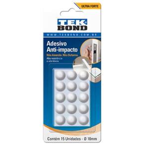 O Adesivo Anti-impacto da Tekbond é ideal para proteger superfícies e objetos contra riscos, batidas e deslizamentos. Sua fixação é rápida, prática e super forte. Ideal para portas, paredes, maçanetas, gavetas, mesas, etc. Produzido com materiais de altíssima qualidade, não amarela, não deforma e oferece ótima resistência e aderência.Modo de Usar:- Limpe bem a superfície onde deseja aplicar o adesivo;- Certifique-se de que o local esteja livre de poeira ou qualquer tipo de oleosidade;- Retire o adesivo da cartela;- Tome cuidado para não encostar seus dedos na área com adesivo;- Aplique o adesivo no local desejado, pressionando a peça para uma boa fixação.CARACTERÍSTICAS TÉCNICAS:Material: Polímero etileno acetato de vinilaMedidas: 10mm (diâmetro)Formato: GotaAparência: TransparenteOdor: Sem odorTemperatura de aplicação: 5 a 40 °CTemperatura de trabalho: - 20 a 80 °CDureza Shore A: 70Teor de sólidos: 100 %Resistência ao cisalhamento: 2,5 N/mmQuantidade: 15 unidadesPeso: 15gMarca: TekbondRef.: 3796116