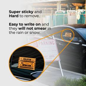 Material: PVC Tamanho: 20x13 cm Aviso de violação — apresenta a mensagem clara “VIOLAÇÃO” em negrito, notificando os proprietários de veículos de que seu carro está estacionado ilegalmente e sujeito a reboque. Design bilíngue — Este decalque inclui texto em inglês e espanhol, tornando-o facilmente compreendido por um público mais amplo, com a mensagem: “INFRAÇÃO” e as instruções correspondentes. Decalque de vinil autoadesivo — Fácil de aplicar em janelas, portas ou outras superfícies de carros, este adesivo adere firmemente sem deixar resíduos ao ser removido. Notificação de reboque - O adesivo menciona claramente que o veículo está sujeito a reboque e que o número da placa foi registrado, garantindo clareza jurídica. Material de PVC durável — Impermeável e resistente às intempéries, este decalque de PVC de alta qualidade garante um desempenho duradouro em várias condições externas.
