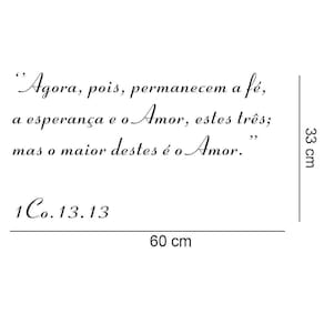 Adesivo de parede 1 coríntios 13:13 As imagens anunciadas são ilustrativas Tamanho do adesivo O adesivo da foto parece grande Então atenção: O modelo que está na foto não se refere ao tamanho do adesivo anunciado. deixamos o adesivo grande para que você possa visualizar melhor o produto que está comprando
