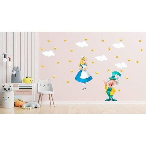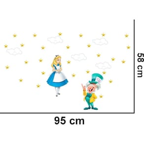 Adesivo de parede alice e o chapeleiro Medida: 95 x 58 cm As imagens anunciadas são ilustrativas Tamanho do adesivo O adesivo da foto parece grande Então atenção: O modelo que está na foto não se refere ao tamanho do adesivo anunciado. deixamos o adesivo grande para que você possa visualizar melhor o produto que está comprando