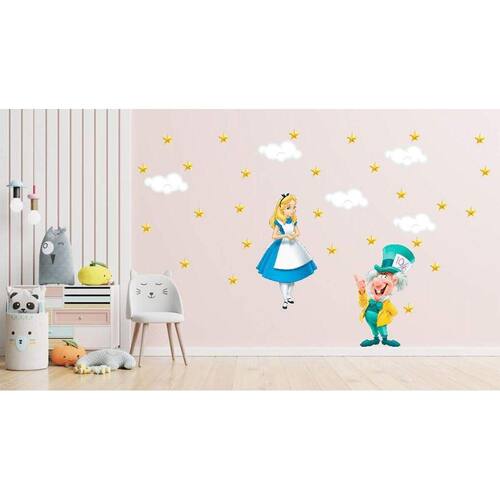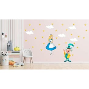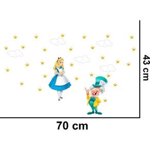 Adesivo de parede alice e o chapeleiro Medida: 70 x 43 cm As imagens anunciadas são ilustrativas Tamanho do adesivo O adesivo da foto parece grande Então atenção: O modelo que está na foto não se refere ao tamanho do adesivo anunciado. deixamos o adesivo grande para que você possa visualizar melhor o produto que está comprando