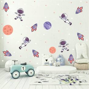 Medida: Contém: 04 Adesivos de Astronauta medindo 27cm cada 06 Adesivos de Foguete medindo 25cm cada 01 Planeta de 22cm, 01 de 18cm e 01 de 15cm 65 estrelas e 20 bolinhas para espalhar