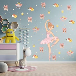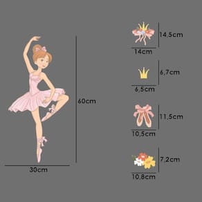 Adesivo De Parede Decorativo Bailarina Balé Ballet MEDIDAS -Kit 1 folha com: * 1 bailarina 30x60 cm * 4 flores com laço 14,5x14 cm * 6 coroas 6,5x6,7 cm * 9 sapatilhas 10,5x11,5 cm * 6 flores 10,8x7,2 cm * 20 flores pequenas 2,5x2,5 cm * 27 pontinhos brancos 0,8x0,8 cm MATERIAL -adesivo vinílico fosco não tóxico TIPO DE IMPRESSÃO - Impressão em alta resolução livre de imperfeições. OBSERVAÇÕES Podem ser colocados no quarto das crianças, na sala de estudos, no escritório, na geladeira, na sala de brinquedos, no box do banheiro ou em muitos outros lugares. A aplicação é muito simples, é só tirar o adesivo e colar como quiser. Os Adesivos já seguem com os recortes para agilizar e facilitar sua instalação, cortes feitos com alta precisão no momento da impressão para garantir a melhor qualidade. Podem ser aplicados em paredes lisas, com tinta acetinada, latex e acrílica, móveis, espelhos, portas, box de banheiro, livres de poeira ou pó de gesso. Não aplicar sobre tinta fresca, tinta magnética, superfícies irregulares ou texturizadas, locais com infiltrações. * Imagem ambiente ilustrativa PRODUTO NÃO TOXICO