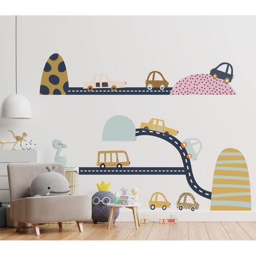 Medida: 01 Adesivo de Morrinho medindo 60cm 01 Adesivo de Morrinho medindo 50cm 01 Adesivo de Morrinho medindo 35cm 01 Adesivo de Morrinho medindo 80cm 05 adesibvos de pista medindo 3,60mt total 09 adesivos de carrinhos medindo 20cm cada