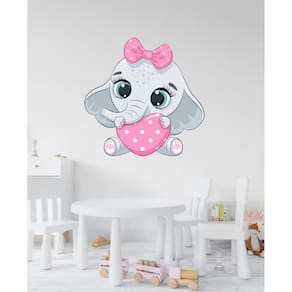 Adesivo de parede elefantinho com coração Medida: 45 x 45 cm As imagens anunciadas são ilustrativas Tamanho do adesivo O adesivo da foto parece grande Então atenção: O modelo que está na foto não se refere ao tamanho do adesivo anunciado. deixamos o adesivo grande para que você possa visualizar melhor o produto que está comprando