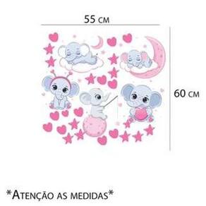 Adesivo de parede elefantinho Medida: 55 x 60 cm As imagens anunciadas são ilustrativas Tamanho do adesivo O adesivo da foto parece grande Então atenção: O modelo que está na foto não se refere ao tamanho do adesivo anunciado. deixamos o adesivo grande para que você possa visualizar melhor o produto que está comprando