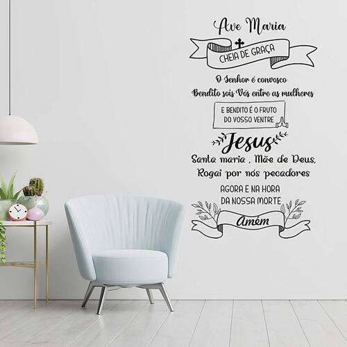 Adesivo de parede frase ave maria mod01 Medida: 58 x 100 cm As imagens anunciadas são ilustrativas Tamanho do adesivo O adesivo da foto parece grande Então atenção: O modelo que está na foto não se refere ao tamanho do adesivo anunciado. deixamos o adesivo grande para que você possa visualizar melhor o produto que está comprando Vantagens: - já vai recortado - fácil aplicação e sem sujeira, não precisa de cola. - acompanha manual impresso. - renovação do ambiente. É o fim das paredes brancas, sem vida Onde aplicar Em qualquer superfície lisa. Onde não aplicar Paredes úmidas, superfícies porosas, com relevo, com texturas, irregularidades ou com infiltrações. Local para aplicação: aplique onde sua imaginação mandar paredes, móveis, revestimentos, azulejos, tetos, janelas, portas, vitrines, vidraças, , carros, notebook, banheiro, geladeira e muito mais. Marca: Lojinha Da Luc Adesivos Ean: 8001250006479