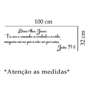 Adesivo de parede frase joão 14:6 Medida: 100 x 32 cm As imagens anunciadas são ilustrativas Tamanho do adesivo O adesivo da foto parece grande Então atenção: O modelo que está na foto não se refere ao tamanho do adesivo anunciado. deixamos o adesivo grande para que você possa visualizar melhor o produto que está comprando Vantagens: - já vai recortado - fácil aplicação e sem sujeira, não precisa de cola. - acompanha manual impresso. - renovação do ambiente. É o fim das paredes brancas, sem vida Onde aplicar Em qualquer superfície lisa. Onde não aplicar Paredes úmidas, superfícies porosas, com relevo, com texturas, irregularidades ou com infiltrações. Local para aplicação: aplique onde sua imaginação mandar paredes, móveis, revestimentos, azulejos, tetos, janelas, portas, vitrines, vidraças, , carros, notebook, banheiro, geladeira e muito mais. Marca: Não Informado Ean: 8001250000712