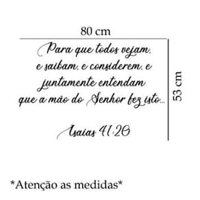 Adesivo de parede frase versículo isaias 41:20 mod01 Medida: 80 x 53 cm Atenção as medidasOs adesivos decorativos são produzidos com material de alta qualidade.As imagens anunciadas são ilustrativas Tamanho do adesivoO adesivo da foto parece grandeEntão atenção:O modelo que está na foto não se refere ao tamanho do adesivo anunciado. deixamos o adesivo grande para que você possa visualizar melhor o produto que está comprando Material Vinil adesivo. É só destacar e colar Nossos adesivos são específicos para superfícies lisas, por isso se adequam a paredes, vidros, madeiras e demais superfícies sem texturas. Importante lembrar de conferir que o local para aplicação está devidamente limpo, sem poeiras, gorduras ou demais resíduos. Todos os nossos produtos são enviados com manual de instruções e dicas para aplicação. As imagens anunciadas são ilustrativas Pode haver variações na cor de acordo com as configurações do seu monitor. Confira todas as informações como medidas e quantidade na descrição do produto.