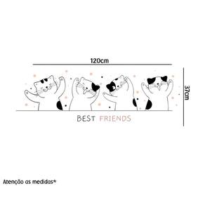 Adesivo de parede gato melhores amigos Medida: 120 x 37 cm As imagens anunciadas são ilustrativas Tamanho do adesivo O adesivo da foto parece grande Então atenção: O modelo que está na foto não se refere ao tamanho do adesivo anunciado. deixamos o adesivo grande para que você possa visualizar melhor o produto que está comprando Vantagens: - já vai recortado - fácil aplicação e sem sujeira, não precisa de cola. - acompanha manual impresso. - renovação do ambiente. É o fim das paredes brancas, sem vida Onde aplicar Em qualquer superfície lisa. Onde não aplicar Paredes úmidas, superfícies porosas, com relevo, com texturas, irregularidades ou com infiltrações. Local para aplicação: aplique onde sua imaginação mandar paredes, móveis, revestimentos, azulejos, tetos, janelas, portas, vitrines, vidraças, , carros, notebook, banheiro, geladeira e muito mais. Marca: Lojinha Da Luc Adesivos Ean: 8001250003829