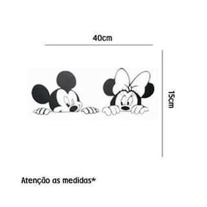 Adesivo de parede mickey e minnie Medida: 40 x 15 cm As imagens anunciadas são ilustrativas Tamanho do adesivo O adesivo da foto parece grande Então atenção: O modelo que está na foto não se refere ao tamanho do adesivo anunciado. deixamos o adesivo grande para que você possa visualizar melhor o produto que está comprando