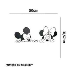 Adesivo de parede mickey e minnie Medida: 80 x 32 cm As imagens anunciadas são ilustrativas Tamanho do adesivo O adesivo da foto parece grande Então atenção: O modelo que está na foto não se refere ao tamanho do adesivo anunciado. deixamos o adesivo grande para que você possa visualizar melhor o produto que está comprando
