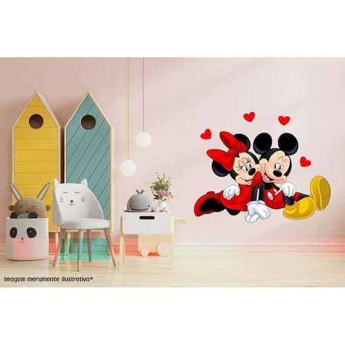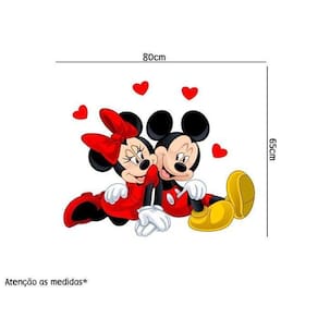 Adesivo de parede minnie e mickey apaixonados Medida: 80 x 65 cm As imagens anunciadas são ilustrativas Tamanho do adesivo O adesivo da foto parece grande Então atenção: O modelo que está na foto não se refere ao tamanho do adesivo anunciado. deixamos o adesivo grande para que você possa visualizar melhor o produto que está comprando